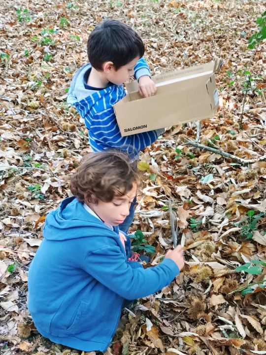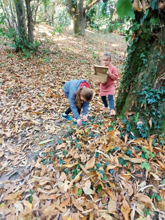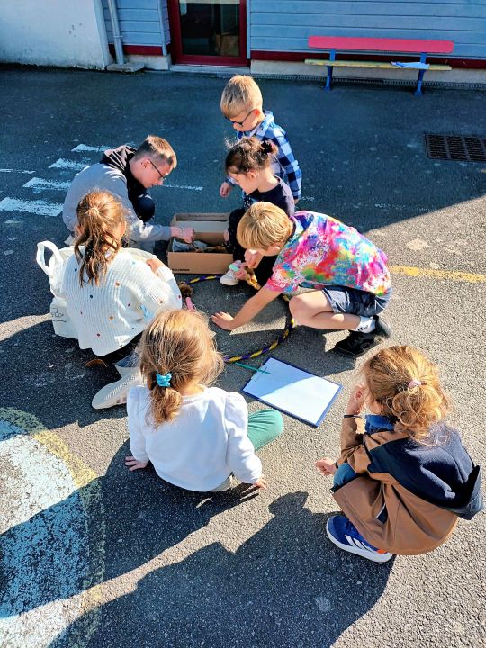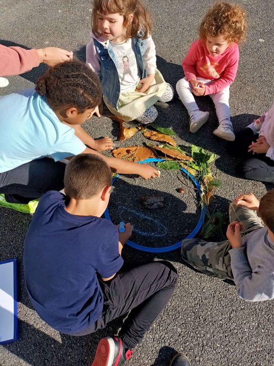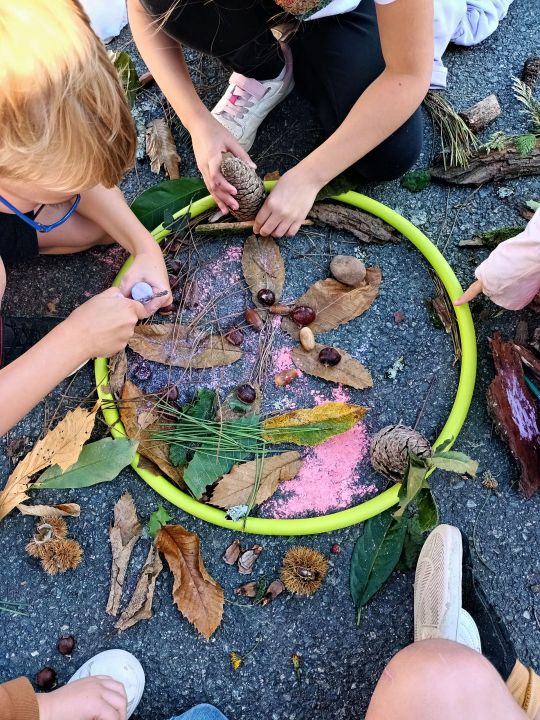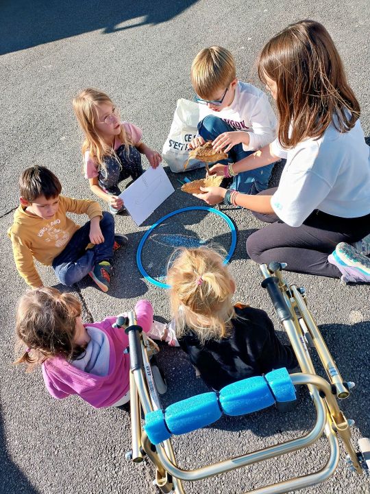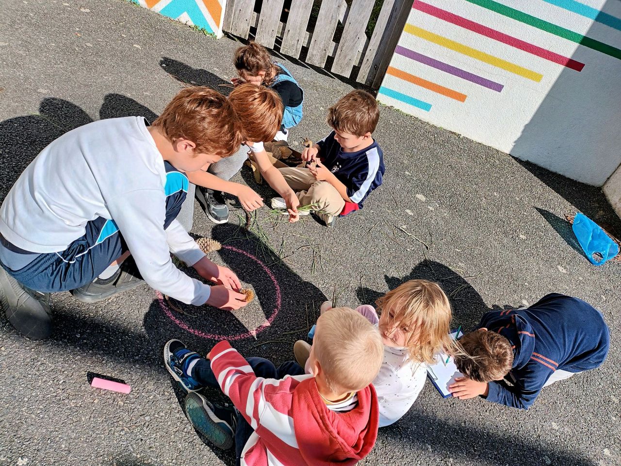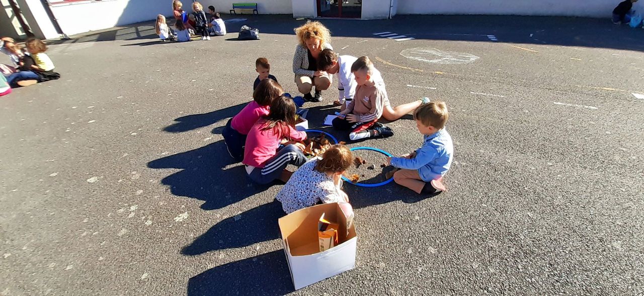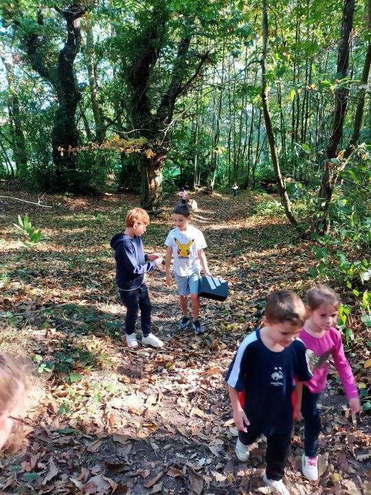Les plus grands ont aidé les plus petits à observer, ramasser, découvrir la nature… et à récolter des trésors : feuilles, bâtons, cailloux, écorces, glands...