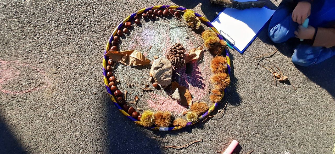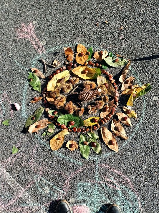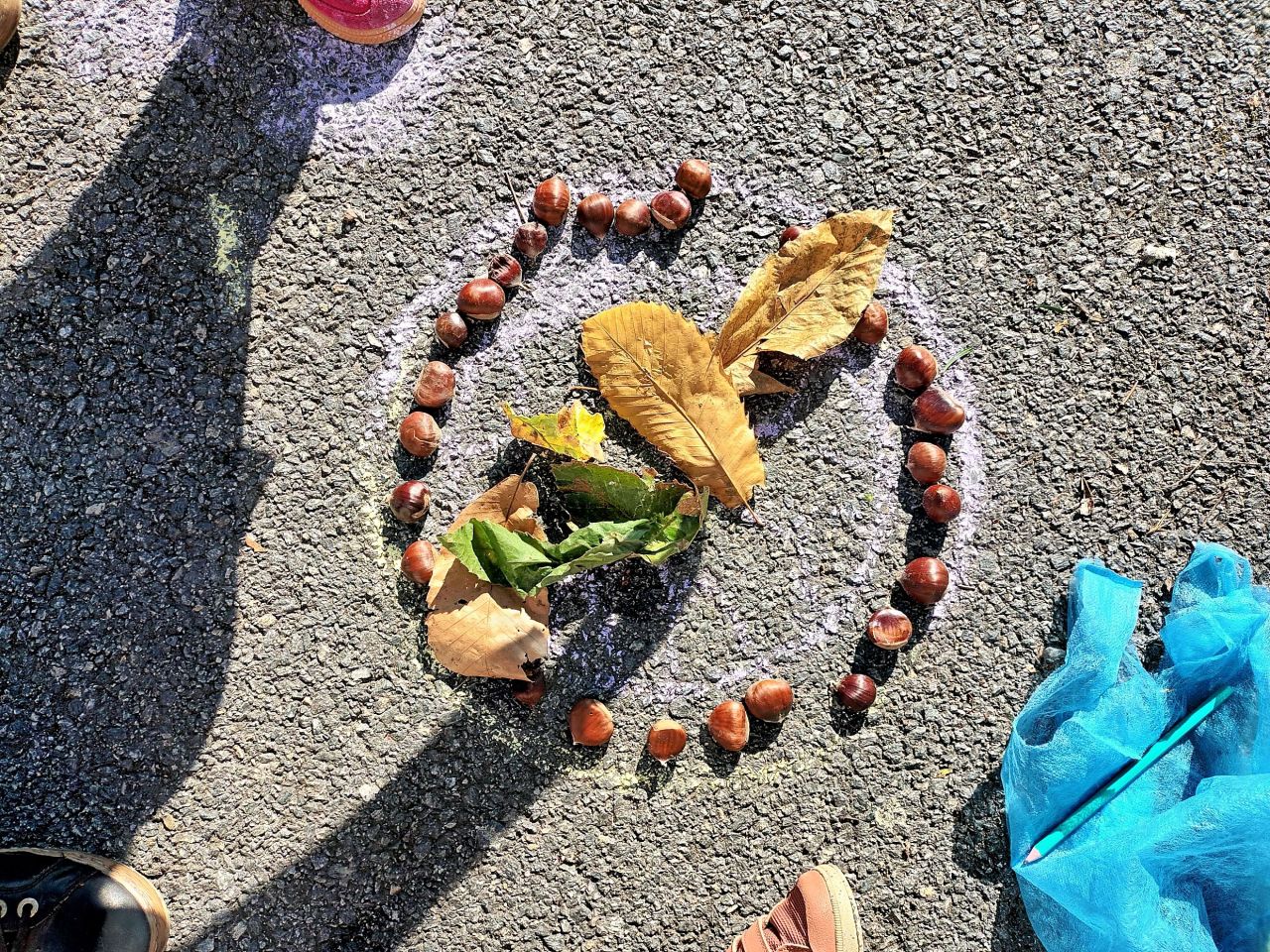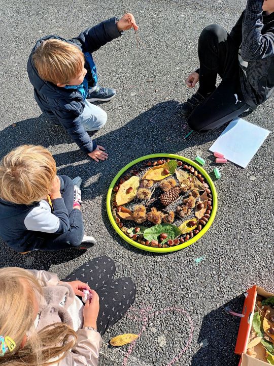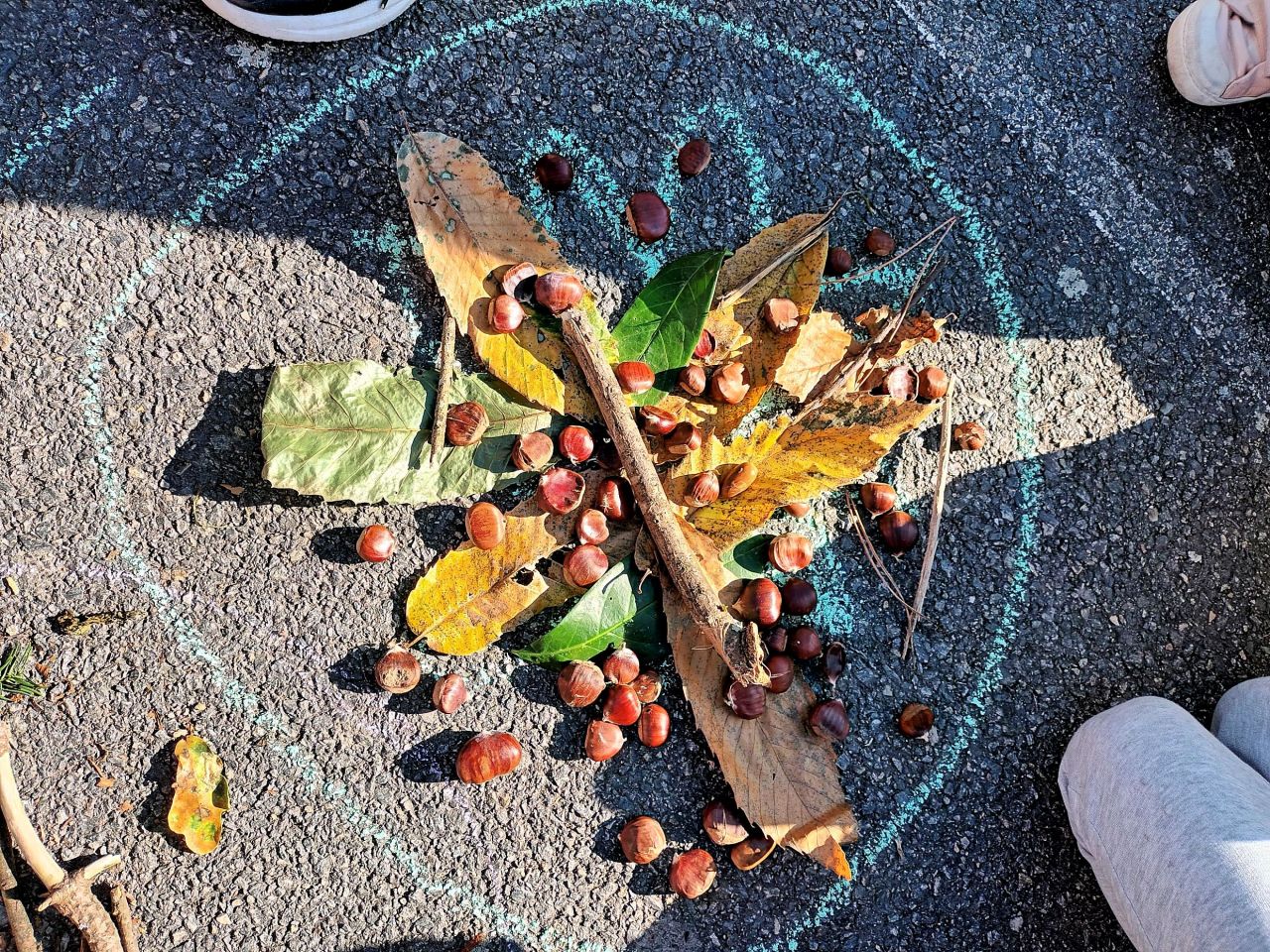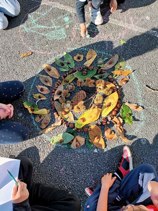 Tous ces éléments naturels vont ensuite servir à créer ensemble des œuvres de land art, sur le sol de la cour.